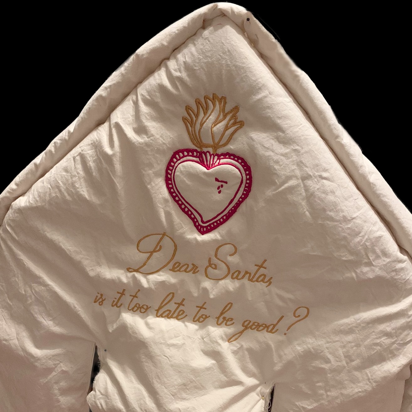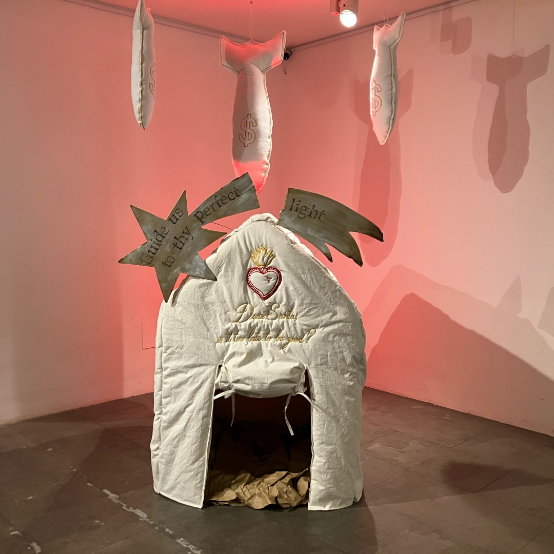 “Dear Santa, is it too late to be good?” è un’opera che nasce da una riflessione profonda e, al tempo stesso, invita lo spettatore a interrogarsi sulla complessa situazione politica e sociale in Medio Oriente. Con un titolo che mescola leggerezza e provocazione, l’opera pone una domanda tanto semplice quanto universale: è mai troppo tardi per cambiare le proprie azioni e per abbracciare il bene?