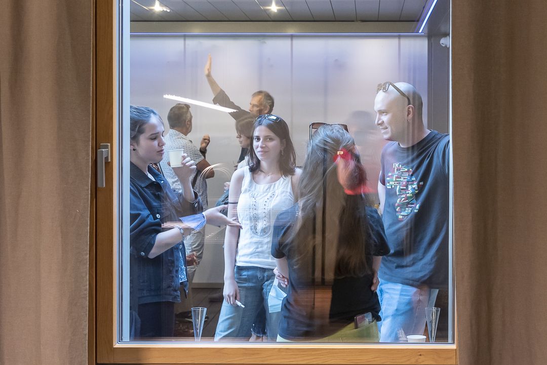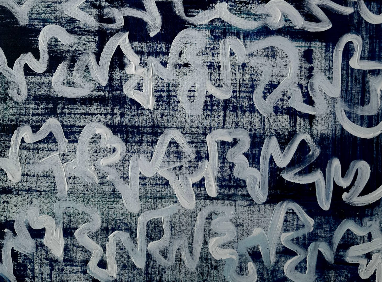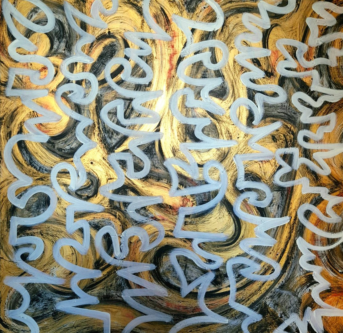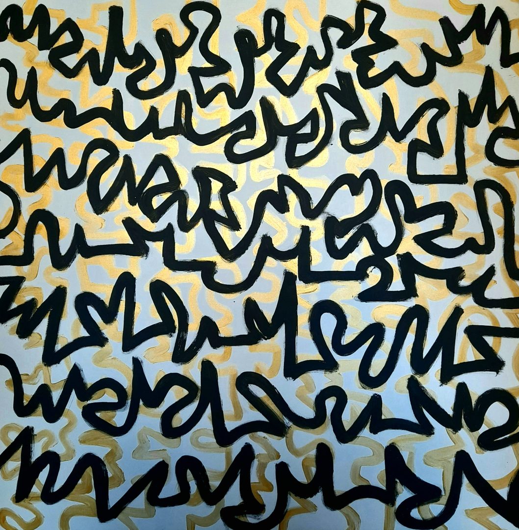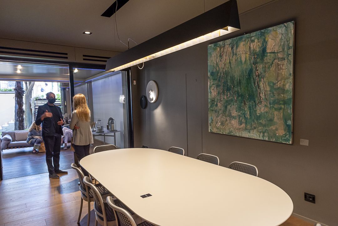 Nella “sala riunioni” i segni ondulati di Flavia Mitolo che fluiscono sulle tele in un intreccio di colori alla ricerca della primordialità del segno e del metalinguaggio. Onde sonore del colore nello spazio.