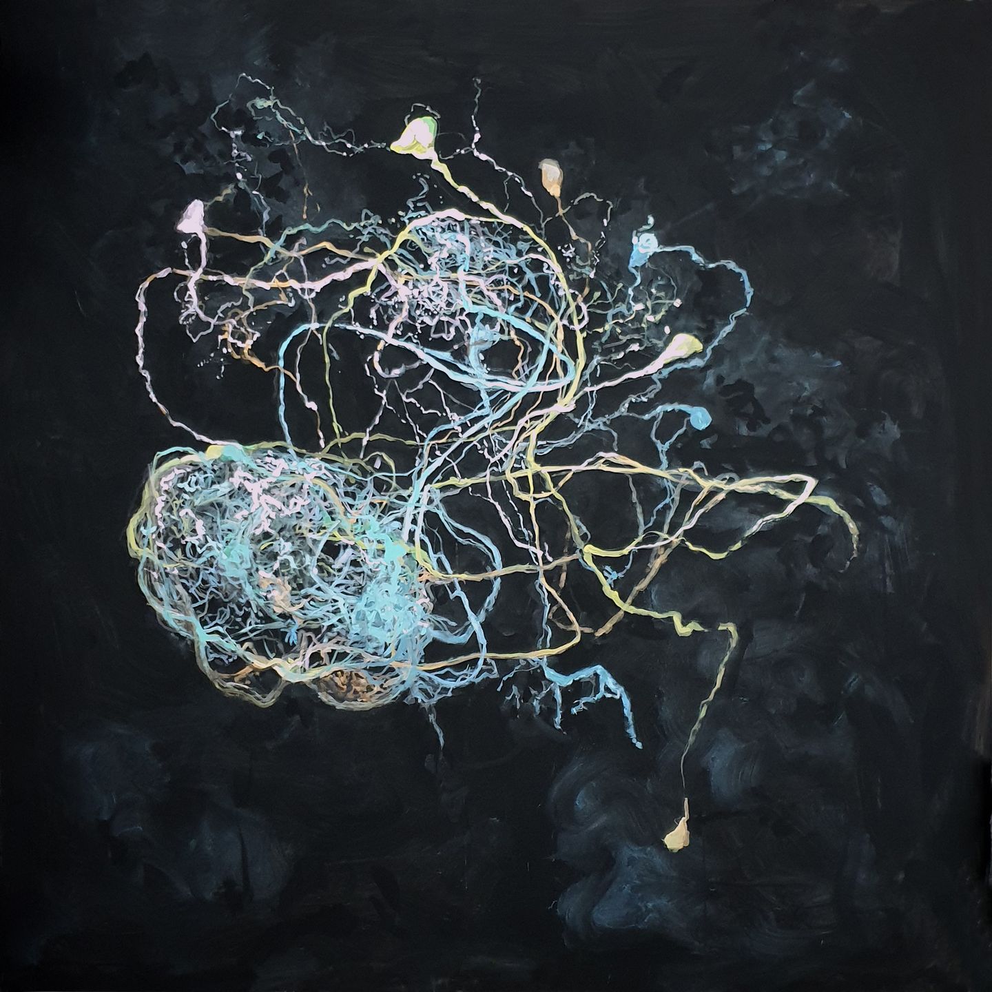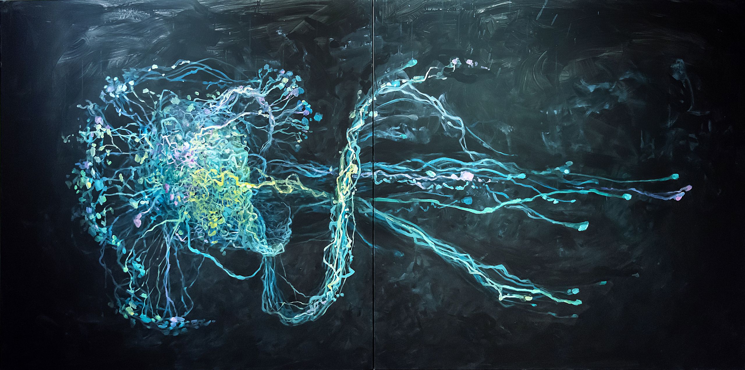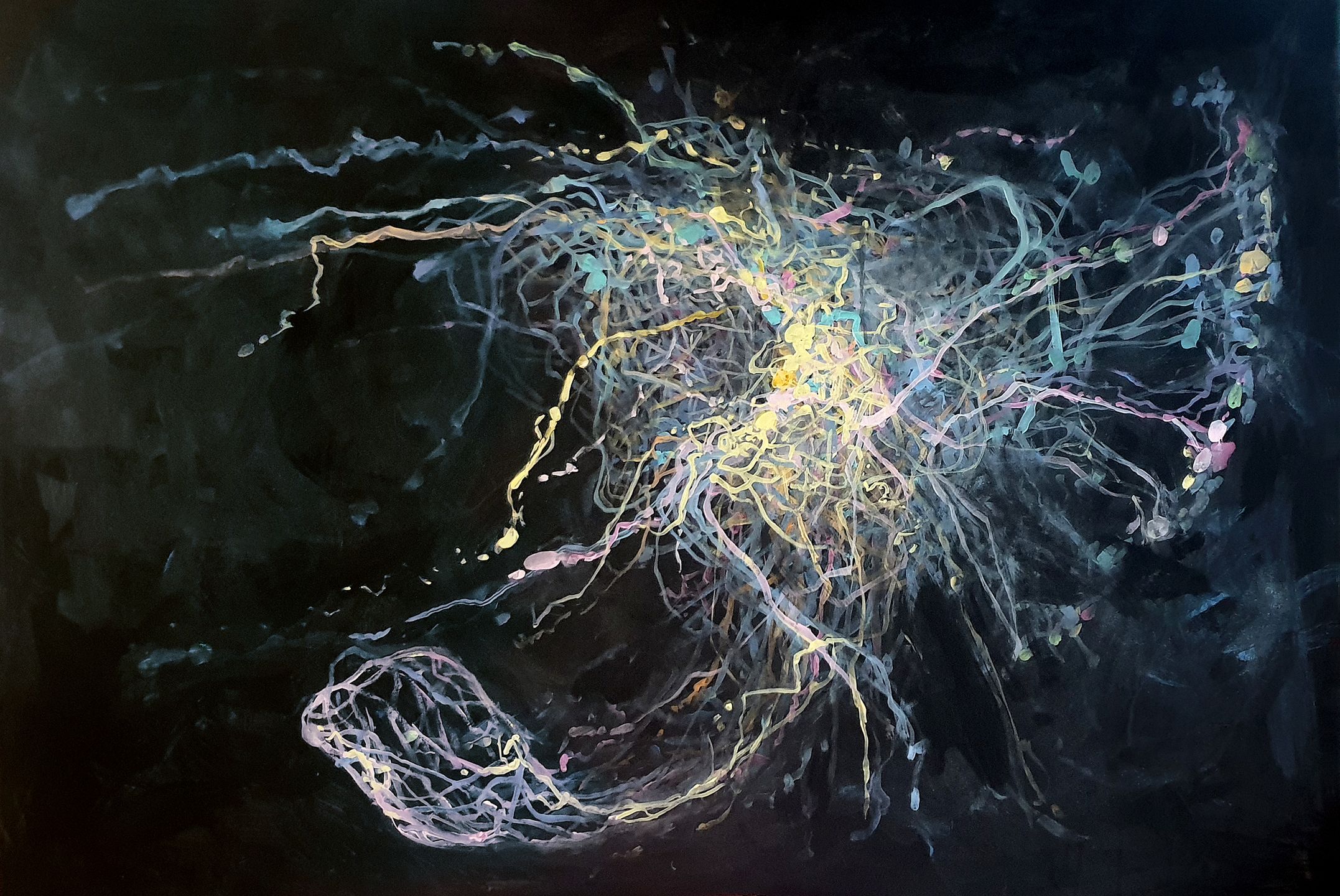 Le opere pittoriche, apparentemente, strisce di colore cangiante, su una base di nero abissale che ci conducono nei fondali dell’oceano e codificano i vortici di queste onde sonore ma anche richiamano le vaste isole di plastica che sempre più numerose fluttuano come una danza macabra nei nostri oceani. Vere isole del colore ma anche della morte.