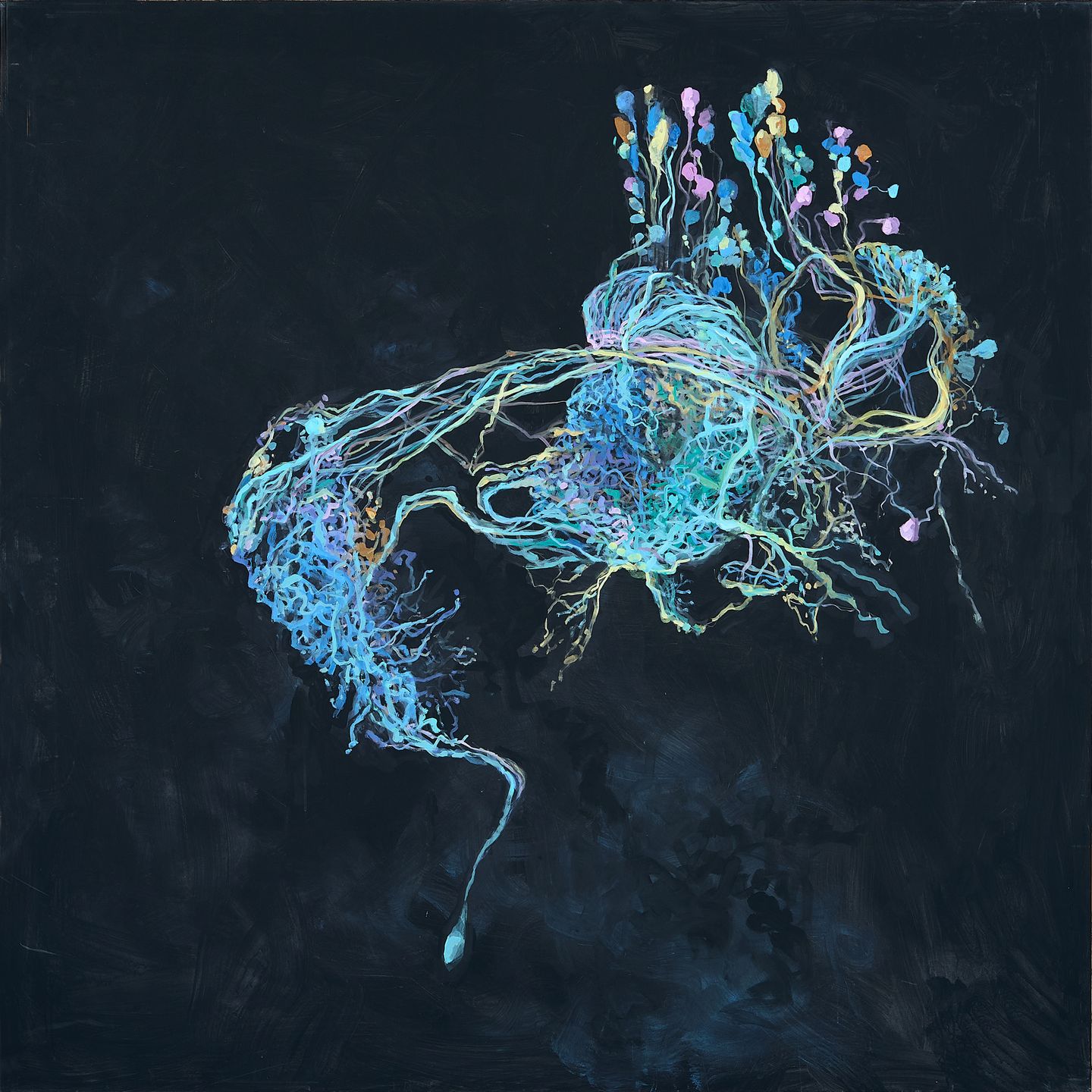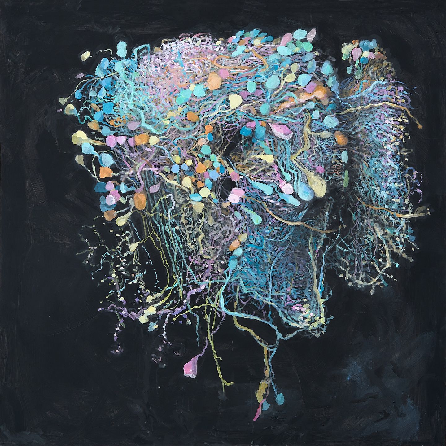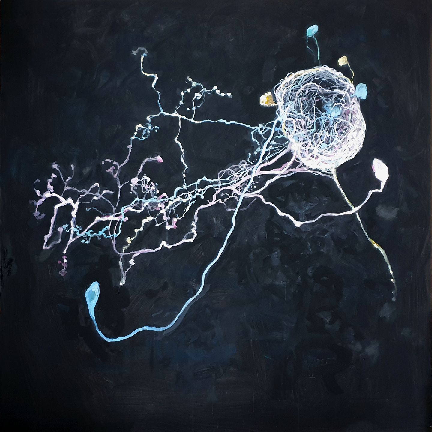 Le opere pittoriche, apparentemente, strisce di colore cangiante, su una base di nero abissale che ci conducono nei fondali dell’oceano e codificano i vortici di queste onde sonore ma anche richiamano le vaste isole di plastica che sempre più numerose fluttuano come una danza macabra nei nostri oceani. Vere isole del colore ma anche della morte.