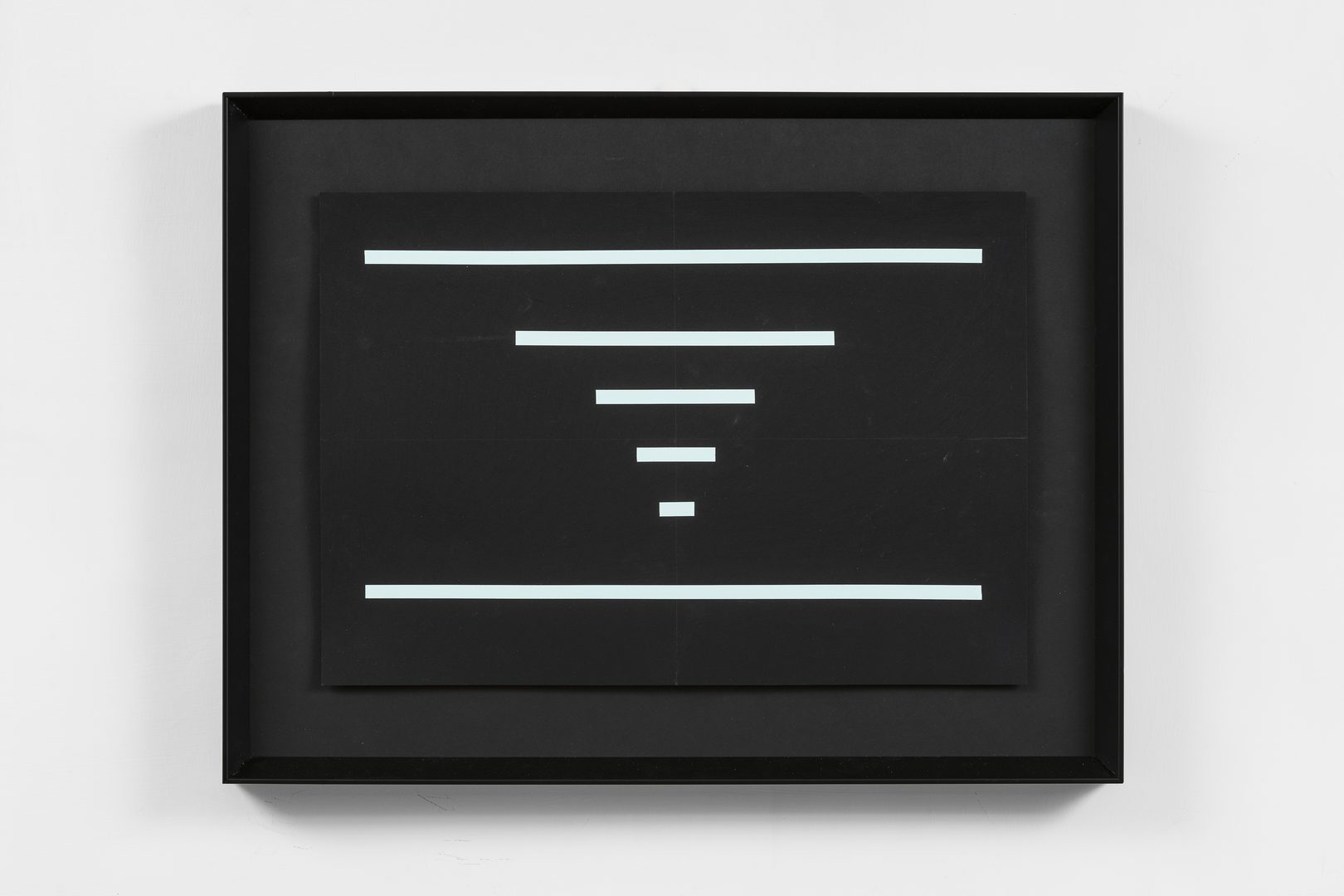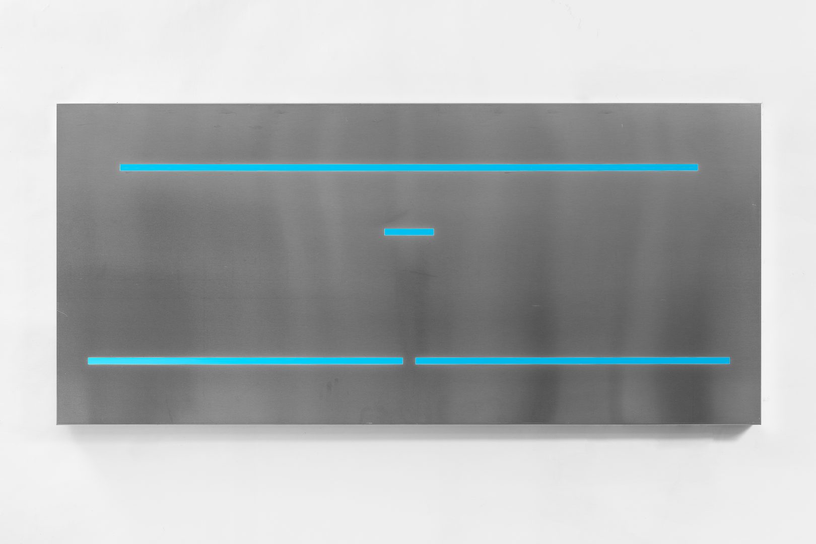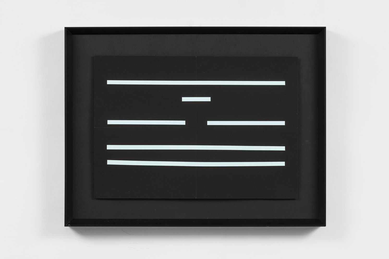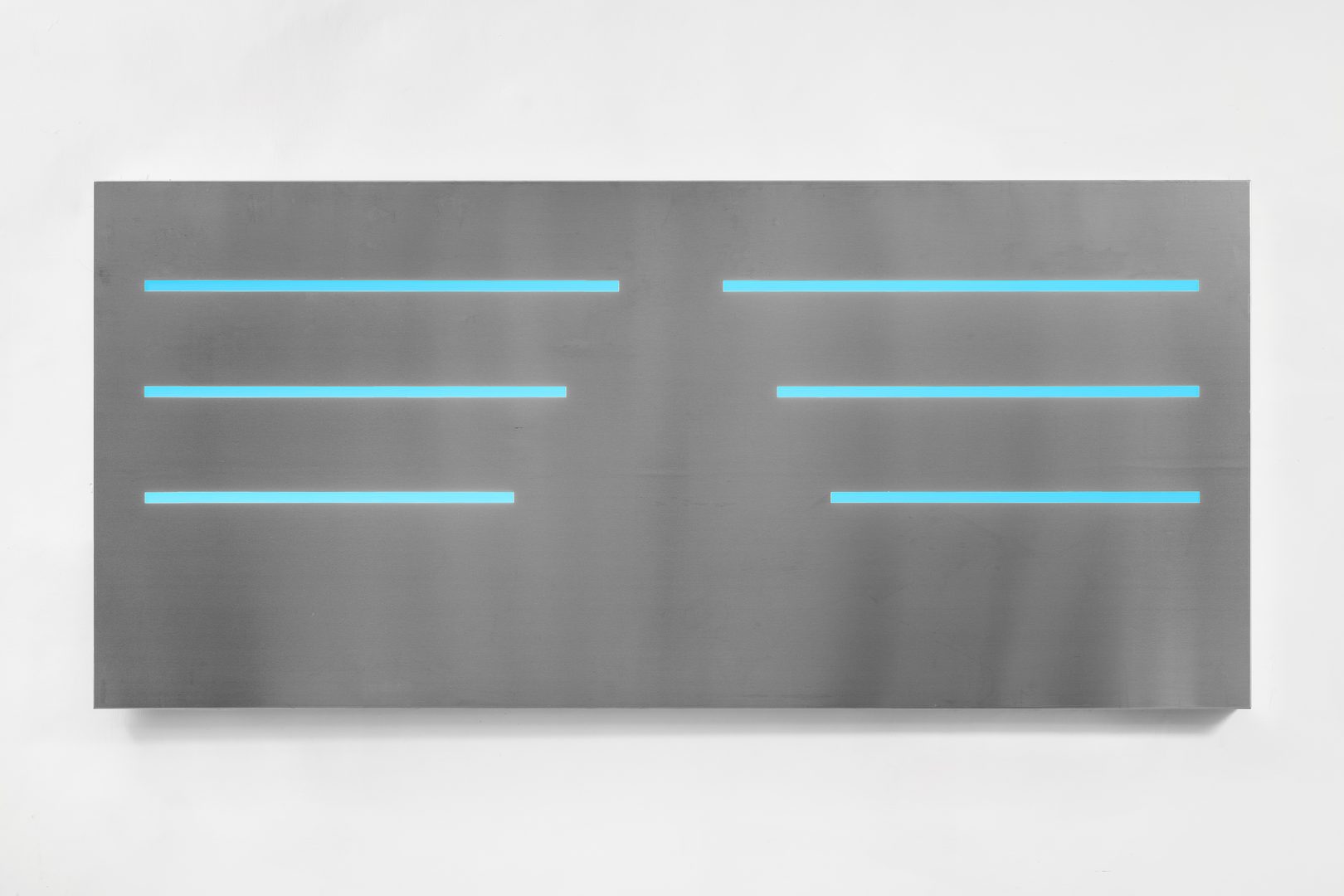 Si tratta di sei grandi lavori in alluminio in cui è stato utilizzato un light tape contenente polvere di fosforo e d’argento. L’elettricità illumina la serie di bande creando un effetto ipnotico. Nelle opere in cartoncino, di dimensione minore, l’artista ha applicato delle strisce adesive opalescenti che sul fondo nero permettono un contrasto che le assimila ai lavori più grandi.
