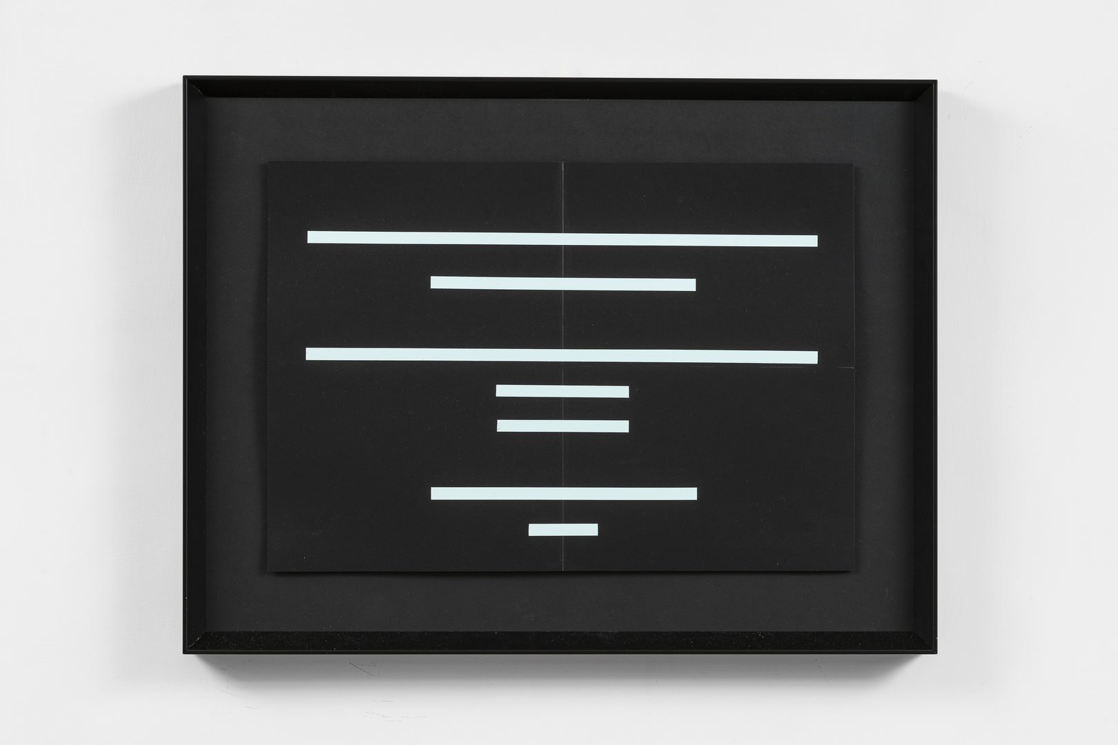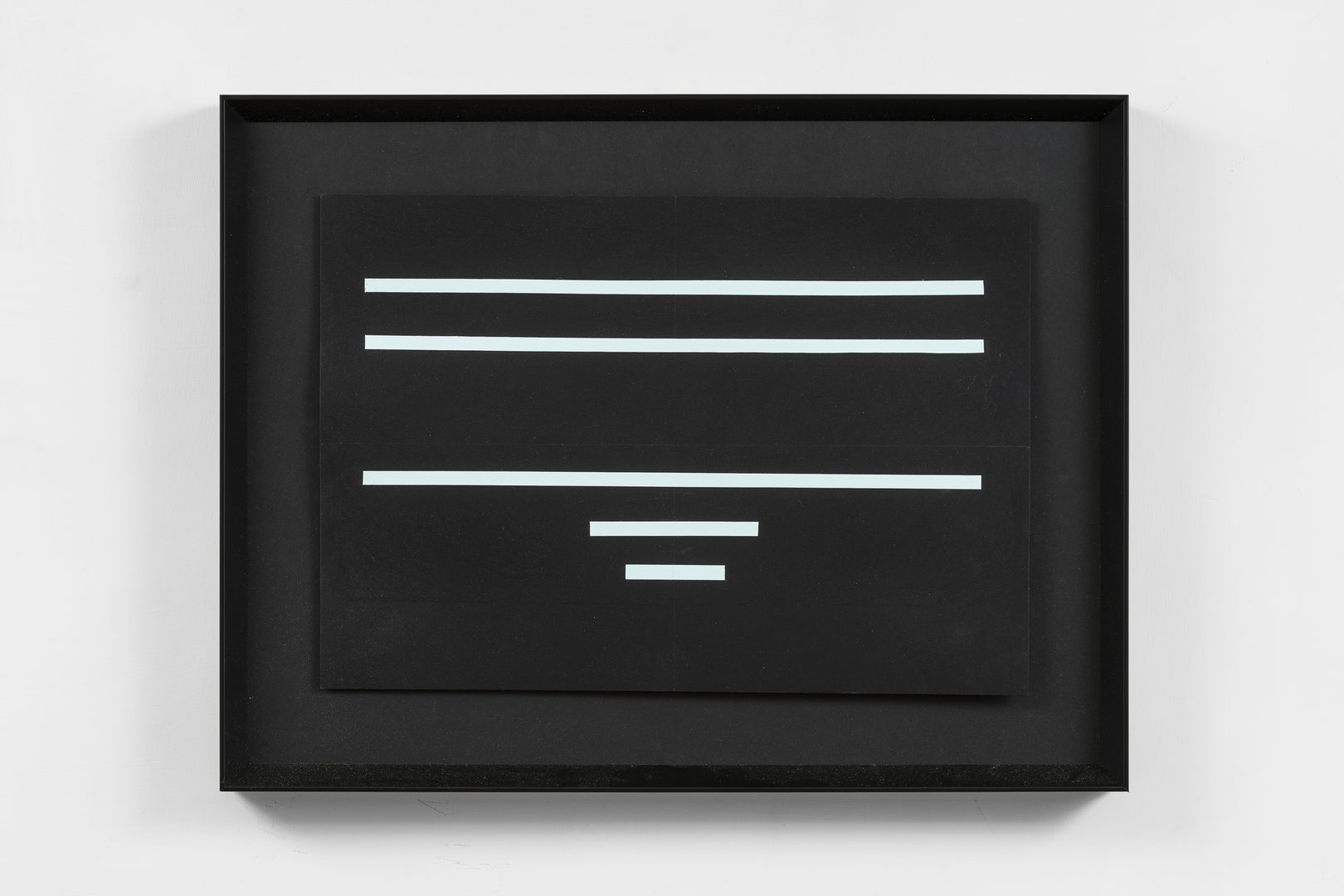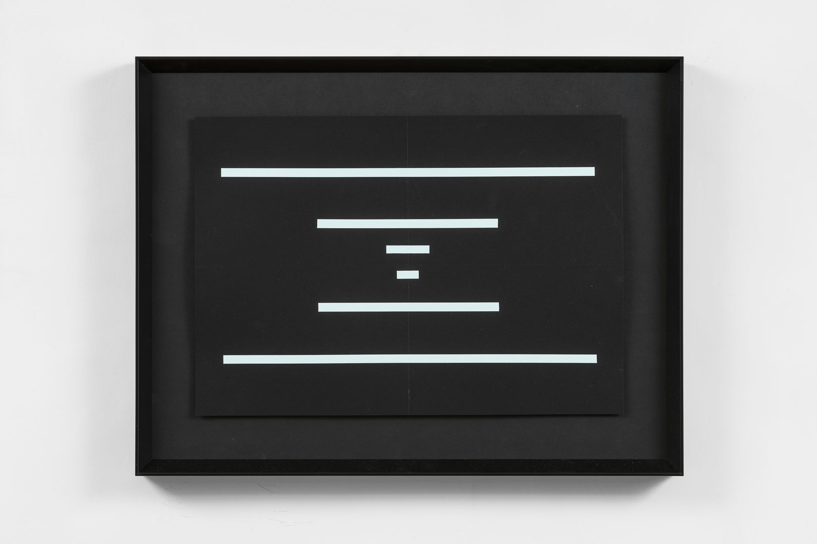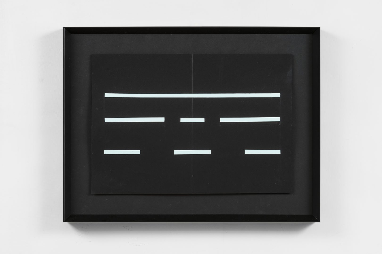Si tratta di sei grandi lavori in alluminio in cui è stato utilizzato un light tape contenente polvere di fosforo e d’argento. L’elettricità illumina la serie di bande creando un effetto ipnotico. Nelle opere in cartoncino, di dimensione minore, l’artista ha applicato delle strisce adesive opalescenti che sul fondo nero permettono un contrasto che le assimila ai lavori più grandi.