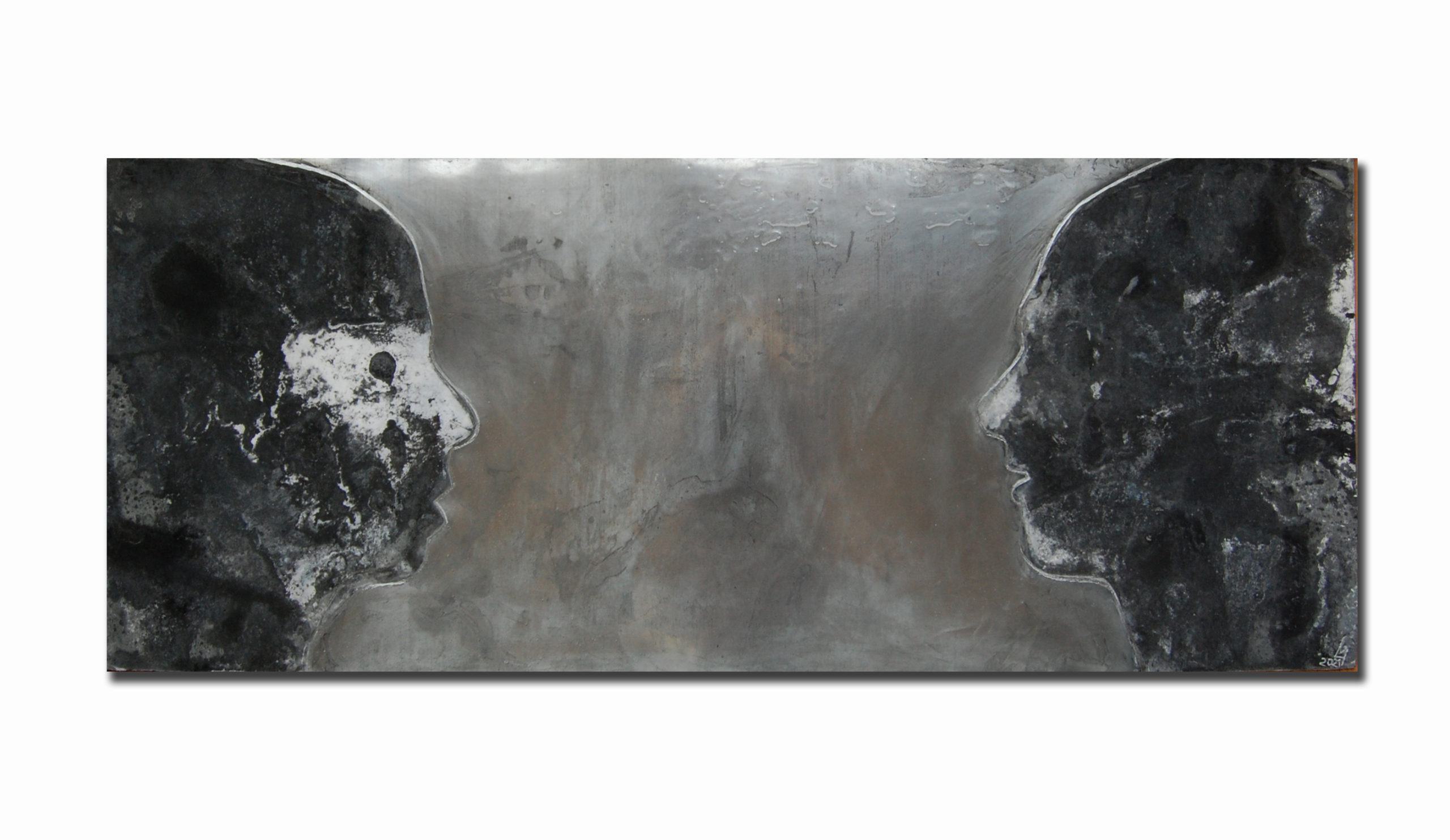 L’individuo consolida le acquisizioni principali che ognuno di noi sperimenta nella vita, ogni opera è un simbolo racchiuso nel profilo che è l’immagine che di noi stessi conosciamo meno, eppure che ci rappresenta in maniera inequivocabile. Dice l’artista «Un volto di profilo è un segno forte, essenziale, riconoscibile ed è l’unico che si può disegnare con un unico tratto continuo. Queste opere dicono che, ad onta della enormi differenze che ci separano l’uno dall’altro, c’è una radice comune in queste vite. E la radice comune è l’arte stessa che riporta ordine, armonia, equilibrio in ciò che può sembrare il massimo del disordine e del caos ossia la vita al di fuori dell’essere».
