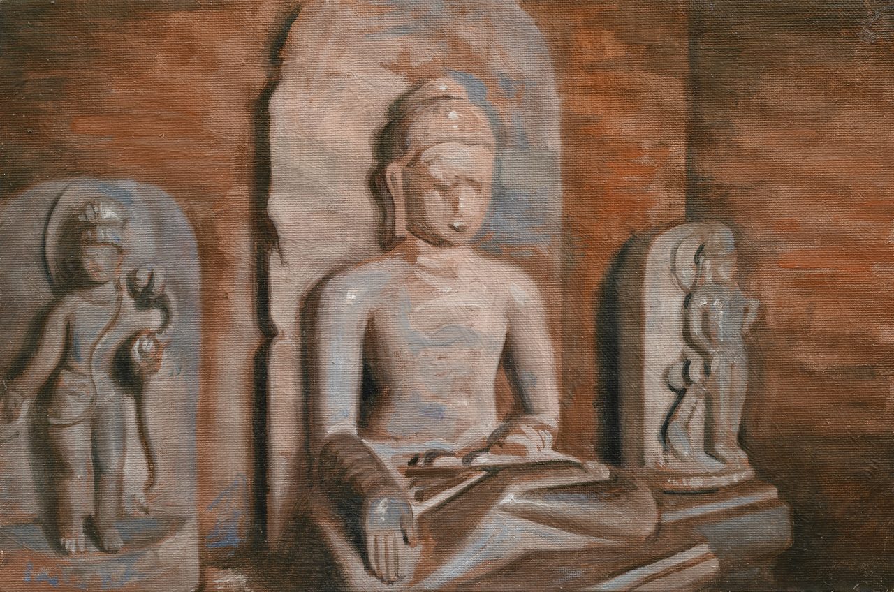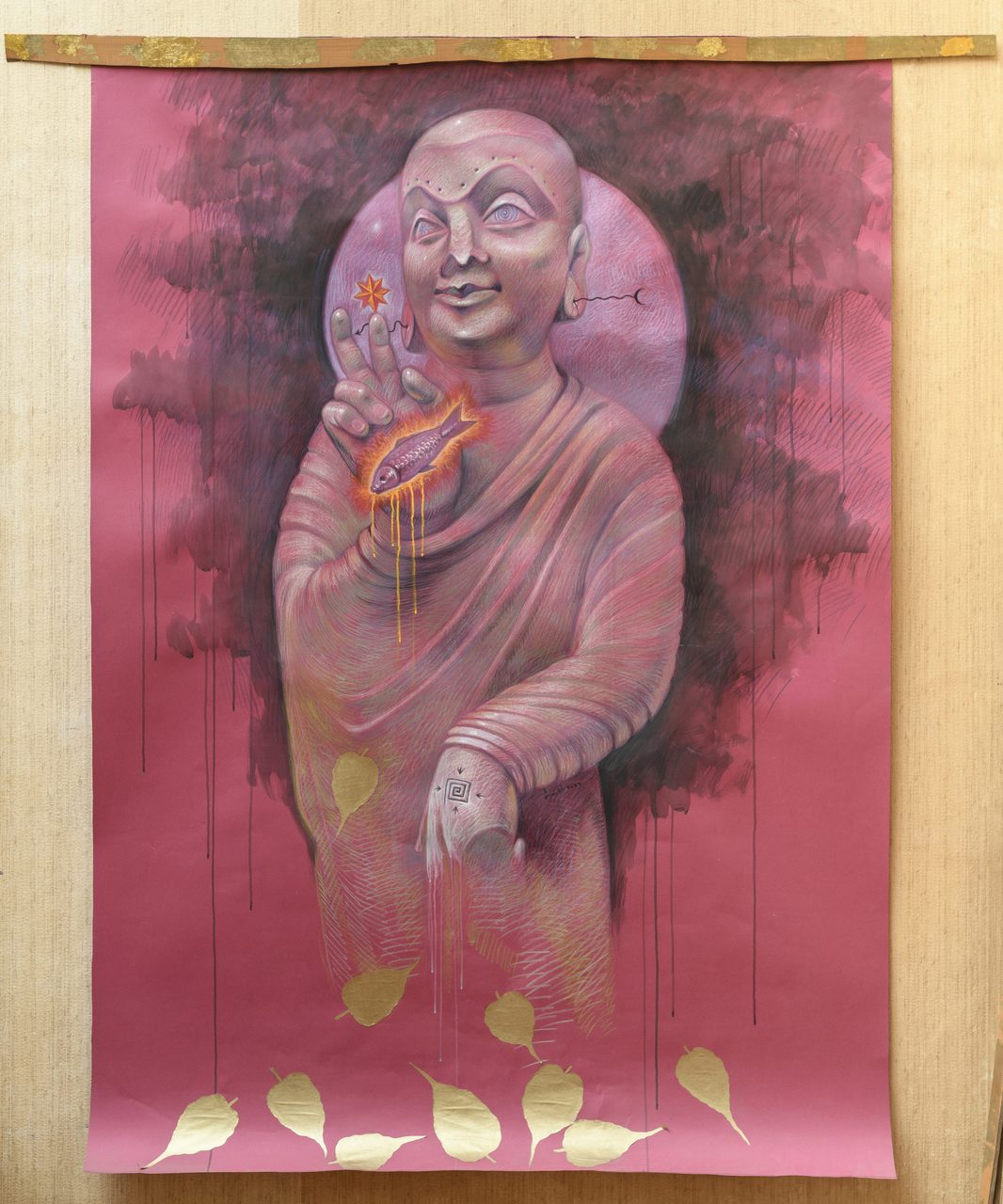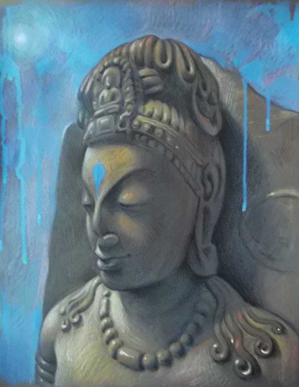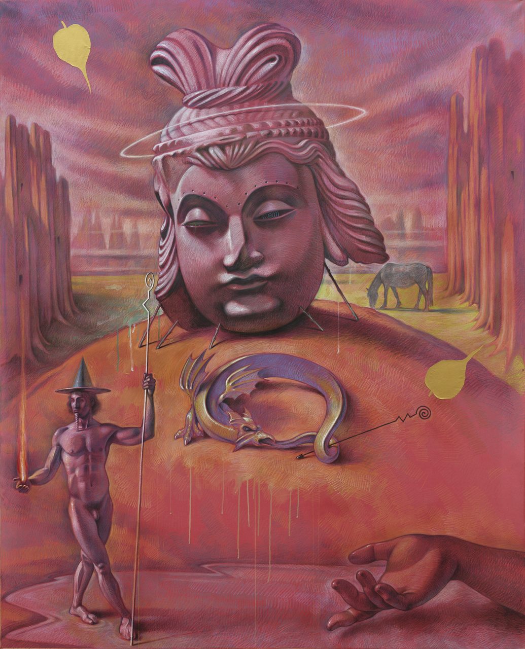 Lavori ispirati ai ricordi di un viaggio, fatto molti anni fà, alla città di Taxila in Pakistan dove scoprì le bellezze dell’arte indogreca e Buddista. Ma anche che, secondo la tradizione, Taxila significa “ la testa mozzata” e segnava il luogo di una storia nella vita di Buddha “in cui egli diede la sua testa a un uomo”. Nell’iconografia buddista è frequente rappresentare la testa di un Buddha senza un corpo, il che, se da un lato sembra qualcosa di incompleto, dall’altro è un simbolo ricco di significato. Di solito nelle statue la testa di Buddha è prominente, per simboleggiare il distacco tra corpo e mente. E di questa “testa” egli ci fornisce gli elementi pittorici di una natura del “Buddha” che ne rappresenta l’essenza della sua religiosità, sempre nell’atto della meditazione. Dove nella parte alta è simboleggiata la comprensione più elevata, i lobi allungati la sua capacità di ascolto del mondo ad un livello superiore, e