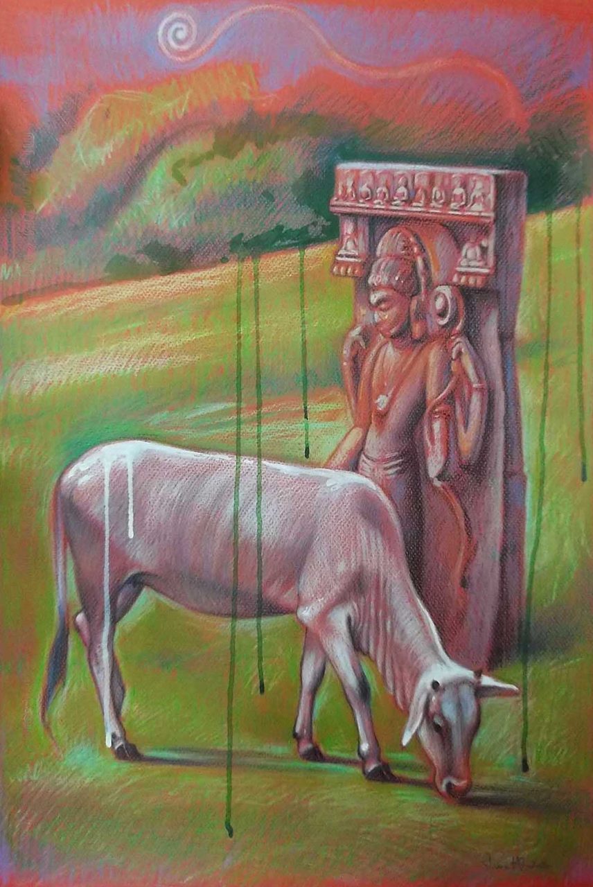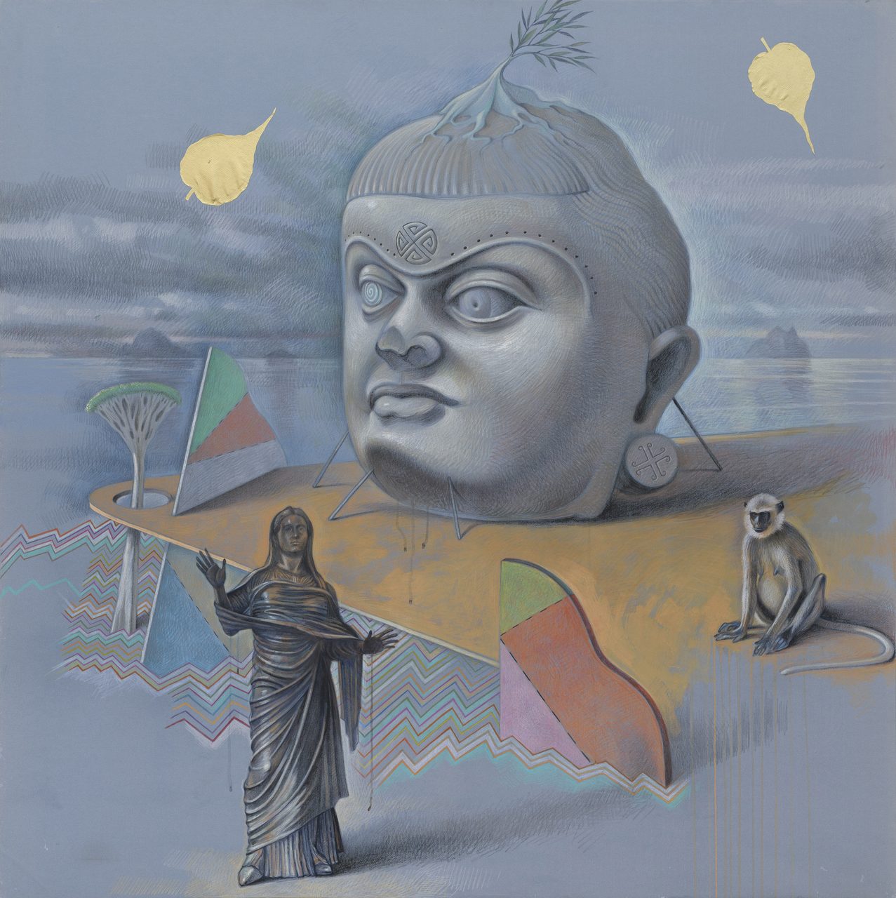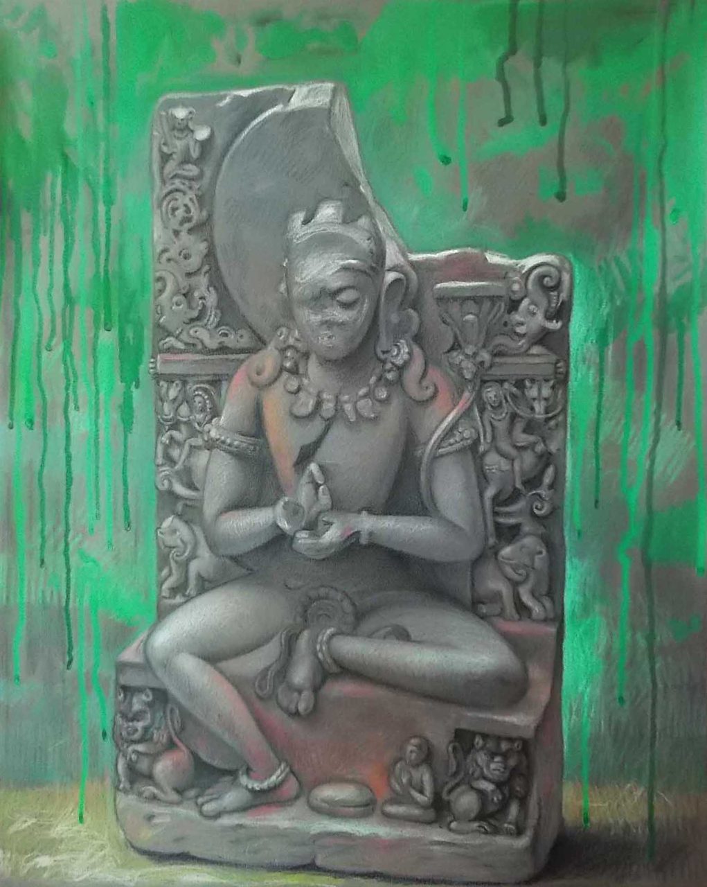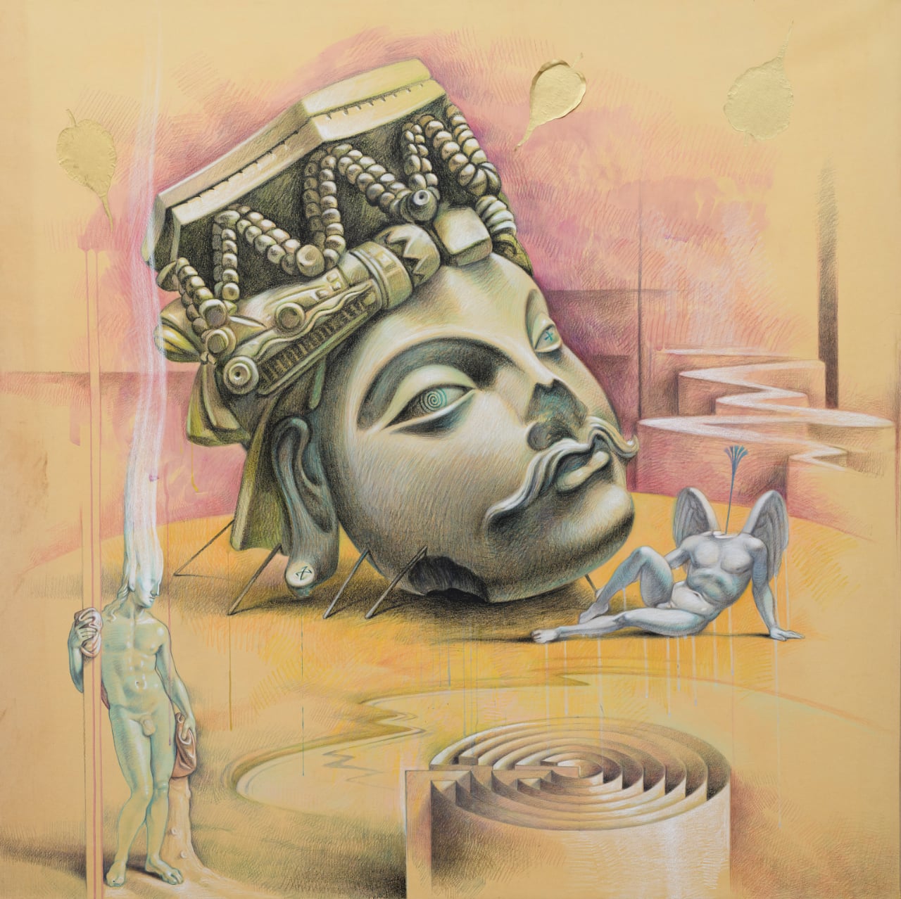 Lavori ispirati ai ricordi di un viaggio, fatto molti anni fà, alla città di Taxila in Pakistan dove scoprì le bellezze dell’arte indogreca e Buddista. Ma anche che, secondo la tradizione, Taxila significa “ la testa mozzata” e segnava il luogo di una storia nella vita di Buddha “in cui egli diede la sua testa a un uomo”. Nell’iconografia buddista è frequente rappresentare la testa di un Buddha senza un corpo, il che, se da un lato sembra qualcosa di incompleto, dall’altro è un simbolo ricco di significato. Di solito nelle statue la testa di Buddha è prominente, per simboleggiare il distacco tra corpo e mente. E di questa “testa” egli ci fornisce gli elementi pittorici di una natura del “Buddha” che ne rappresenta l’essenza della sua religiosità, sempre nell’atto della meditazione. Dove nella parte alta è simboleggiata la comprensione più elevata, i lobi allungati la sua capacità di ascolto del mondo ad un livello superiore, e