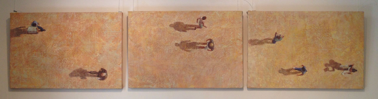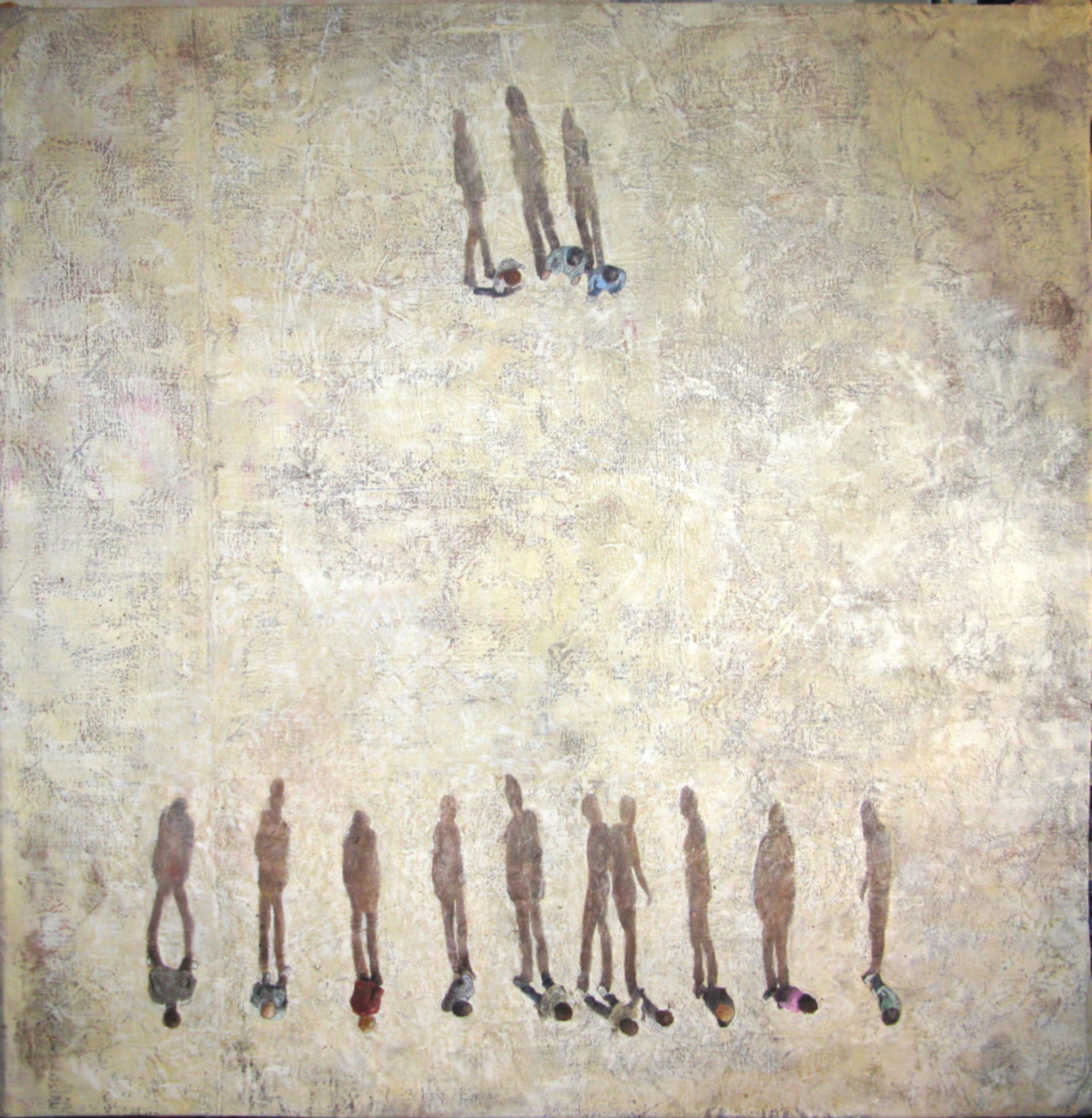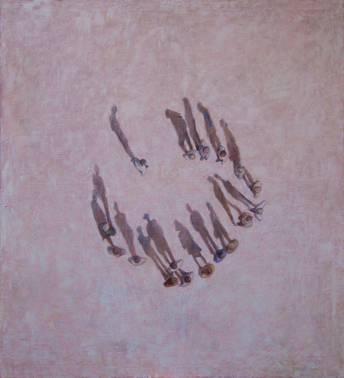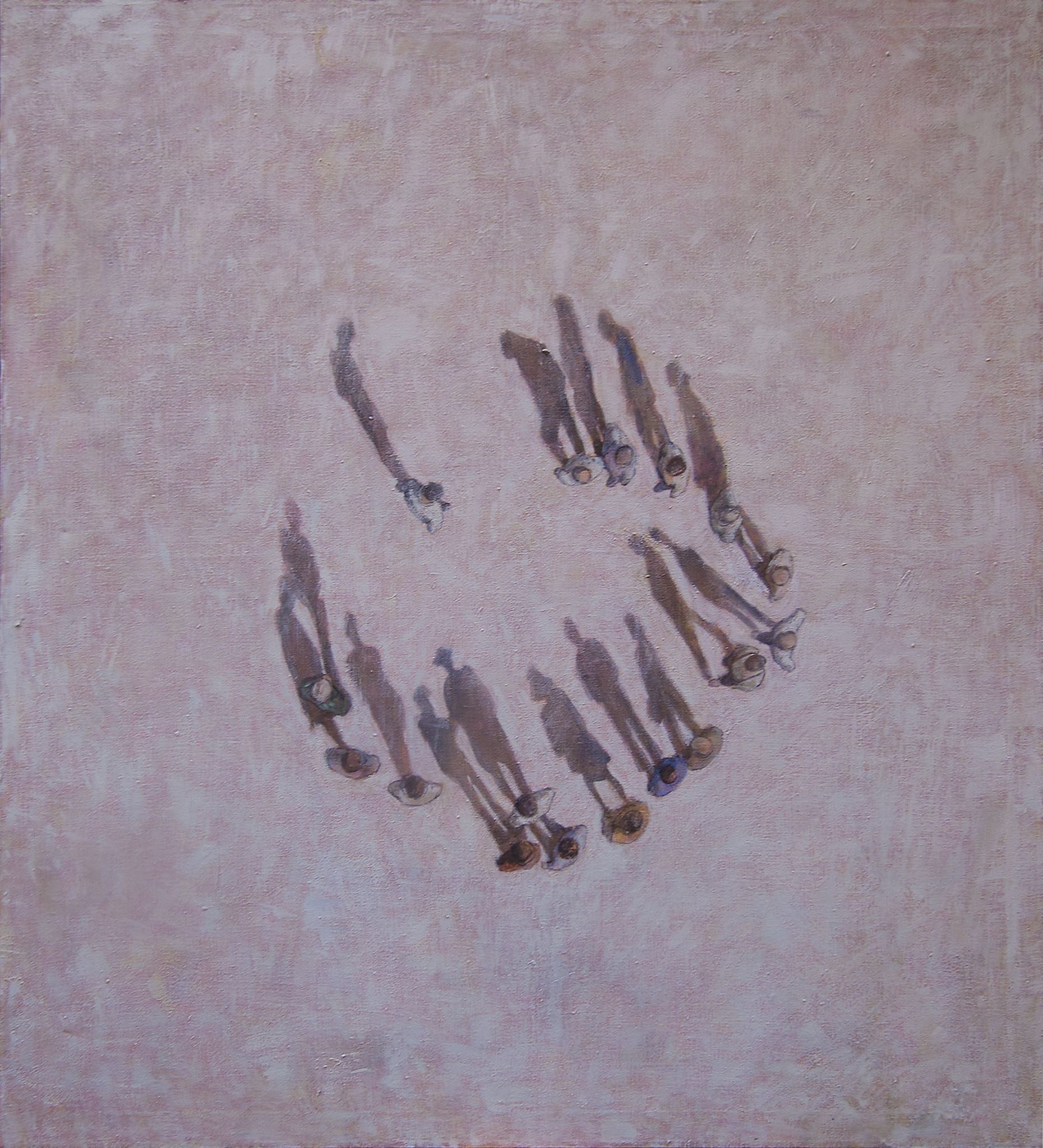 Sorge spontanea una riflessione sull’invisibile, esiste una collocazione geometrica precisa che potrebbe svelare il significato recondito dell’opera e che è stato volutamente nascosto, ed anche la volontà di contrapposizione dei due quadri esposti più grandi; una disposizione circolare ed una lineare che avvalorano le molteplici possibilità relazionali tra gli individui e che ci riconducono allo stesso isolamento proprio, solo le ombre s’incontrano in una molteplicità di rapporti e collegamenti. Viene interpretata la definizione di cerchio che è il simbolo della compiutezza e dell’unione, e di linea retta che ha il significato di ordine, di parità, di schieramento; le ombre che sono in primo piano seguono l’ordinamento geometrico ma ne stravolgono il significato minimizzando l’importanza della disposizione e creando una mescolanza relazionale. Negli altri dipinti l’artista indaga l’individualità delle persone, il trittico “W 54st.” raffigura l’andamento dei passanti in una strada di New York che camminano individualmente dove non c’è commistione e nessun rapporto, sono persone che hanno bisogni e obiettivi accompagnati dalle proprie ombre; in questo caso l’ombra è quel che di noi non può essere risolto in valore collettivo, essa indica la vera individualità e corrispondenza.